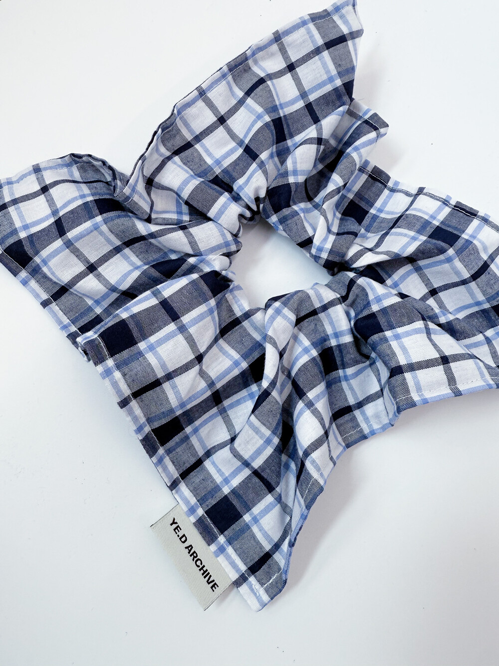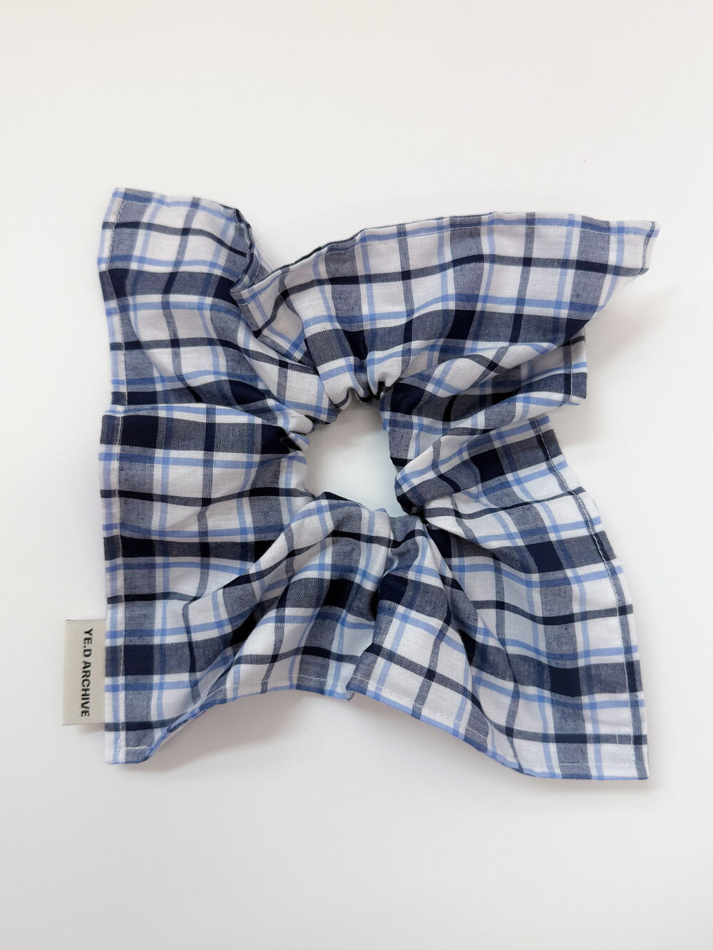 면 100% 원단으로 짜여진 체크 원단 헤어 스크런치입니다. 10골 밴드를 사용하여 매우 짱짱합니다. 예디아카이브의 직조라벨이 옆에 끼워져 있습니다.