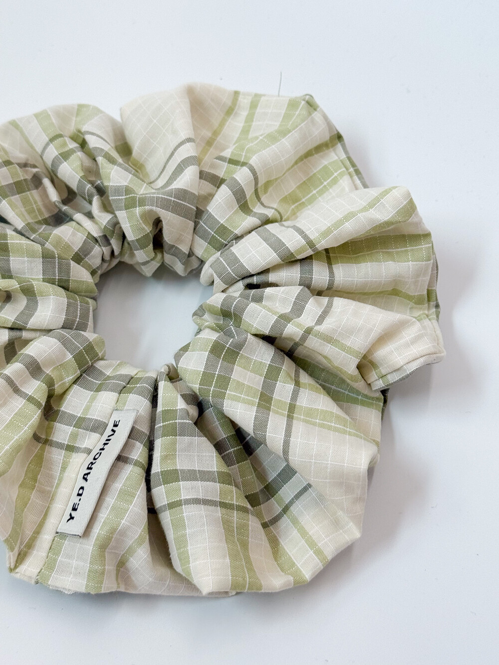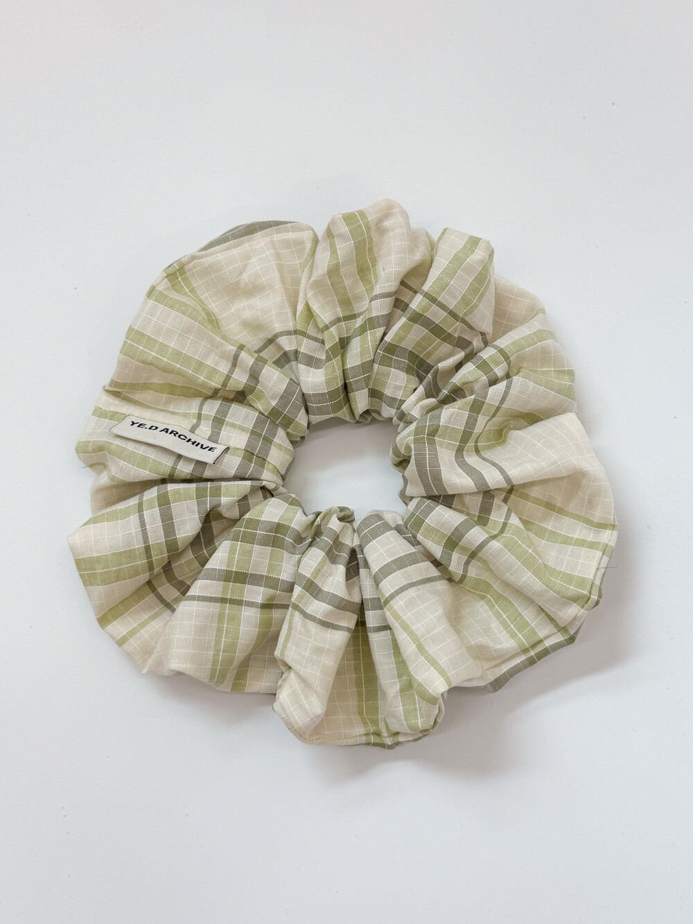 면 100% 원단으로 짜여진 체크 원단 헤어 스크런치입니다. 10골 밴드를 사용하여 매우 짱짱합니다. 예디아카이브의 직조라벨이 옆에 끼워져 있습니다.