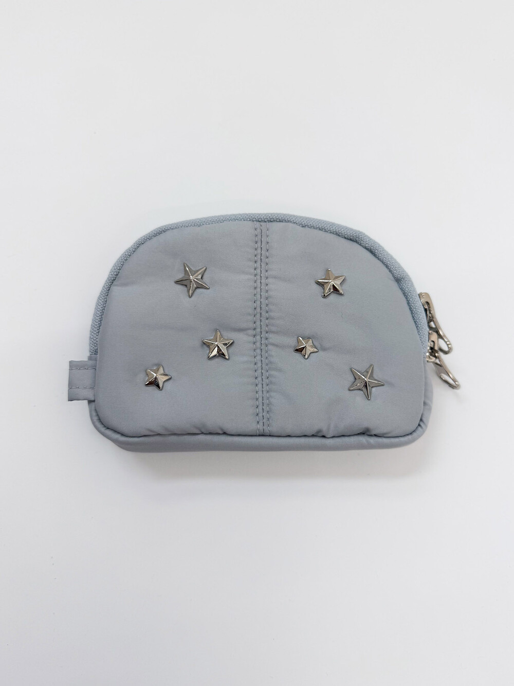 폴리에 솜이 충전재로 들어가 있는 지갑입니다. 별 스터드가 박혀있는 독특한 디자인의 지갑이며, 옆 고리에 카라비너 등과 같은 취향에 맞춰 키링을 끼우셔도 좋습니다.. 내부에 카드 포켓 1개와 코인포켓 1개로 구성되어 있습니다..