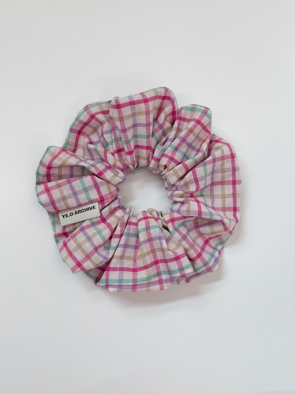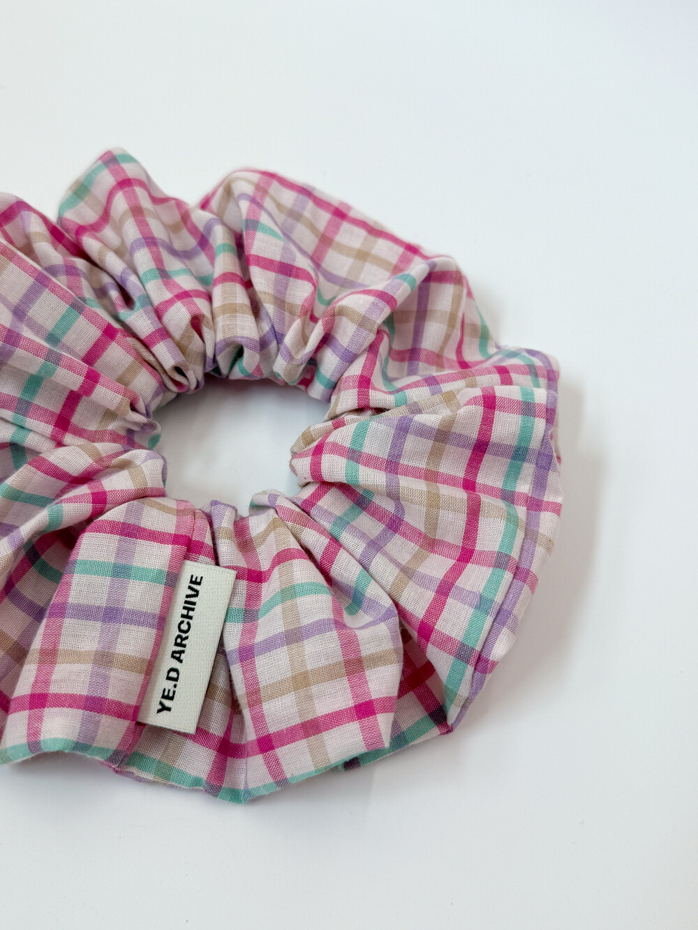 면 100% 원단으로 짜여진 체크 원단 헤어 스크런치입니다. 10골 밴드를 사용하여 매우 짱짱합니다. 예디아카이브의 직조라벨이 옆에 끼워져 있습니다.