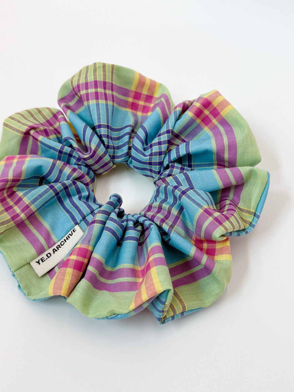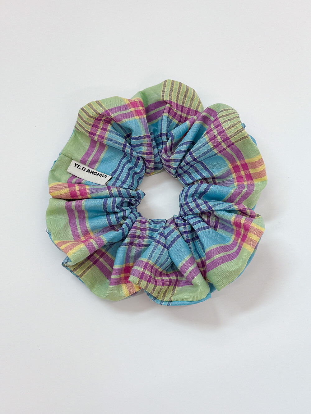 면 100% 원단으로 짜여진 체크 원단 헤어 스크런치입니다. 10골 밴드를 사용하여 매우 짱짱합니다. 예디아카이브의 직조라벨이 옆에 끼워져 있습니다.