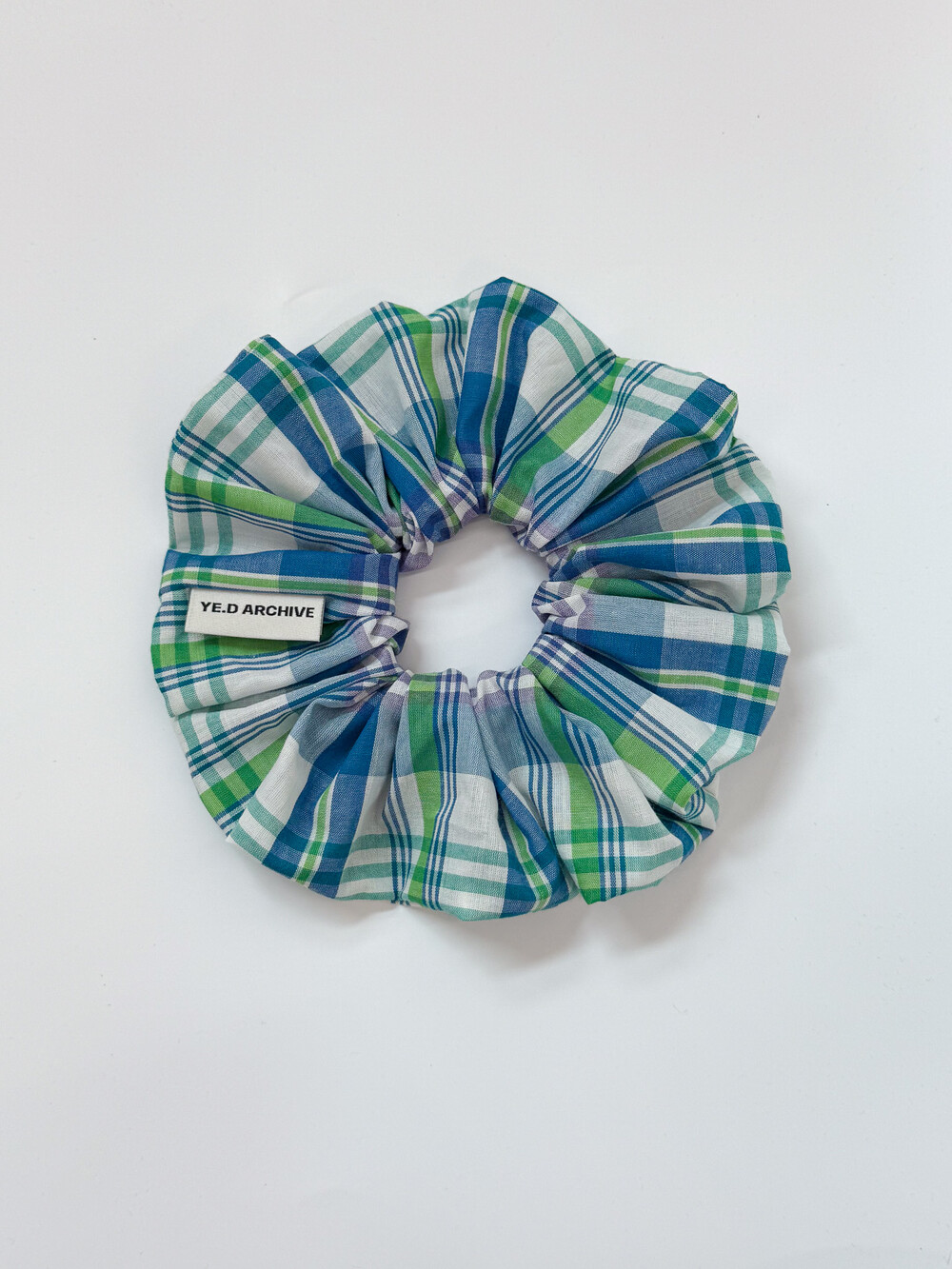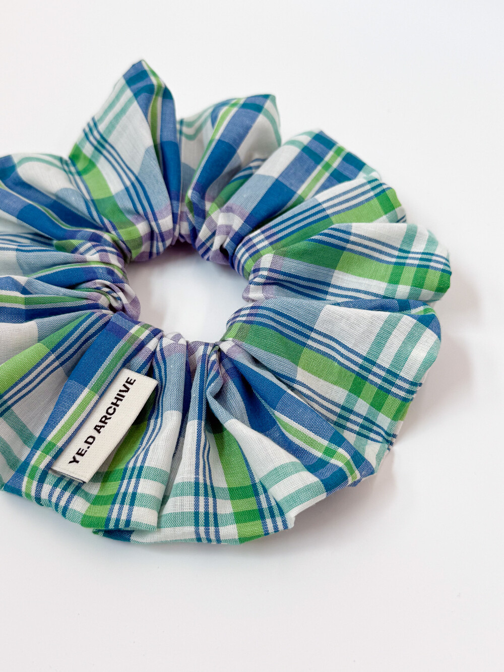 면 100% 원단으로 짜여진 체크 원단 헤어 스크런치입니다. 10골 밴드를 사용하여 매우 짱짱합니다. 예디아카이브의 직조라벨이 옆에 끼워져 있습니다.