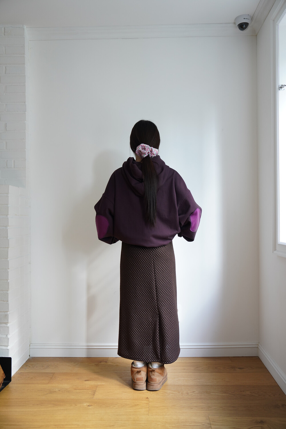 니트로 짜여진 원단에 도트 무늬가 나염되어 있는것이 특징입니다. 허리의 스트링이 있어 다양한 체형의 피팅이 가능하도록 만들었으며, 뒷 부분 트임을 통해 걸었을때 불편하지 않도록 실용성을 더하였습니다. 니트소재 특성상 늘어남이 있고 안감도 신축성이 있는 제품으로 편안하게 착용 가능합니다.
