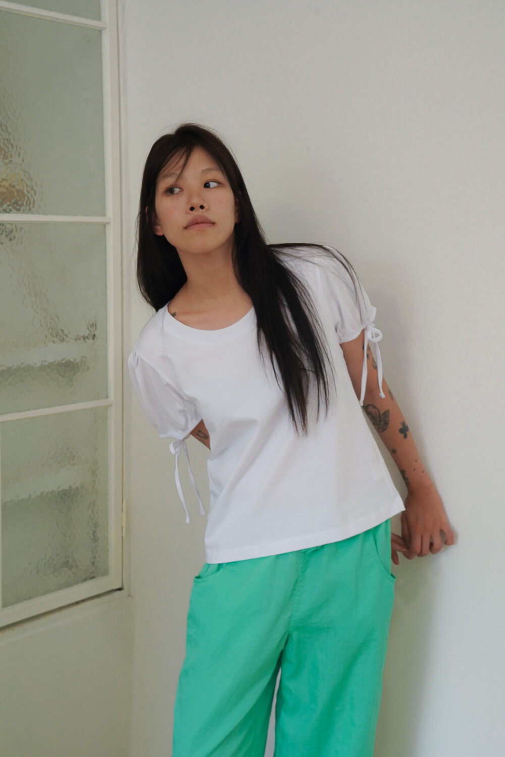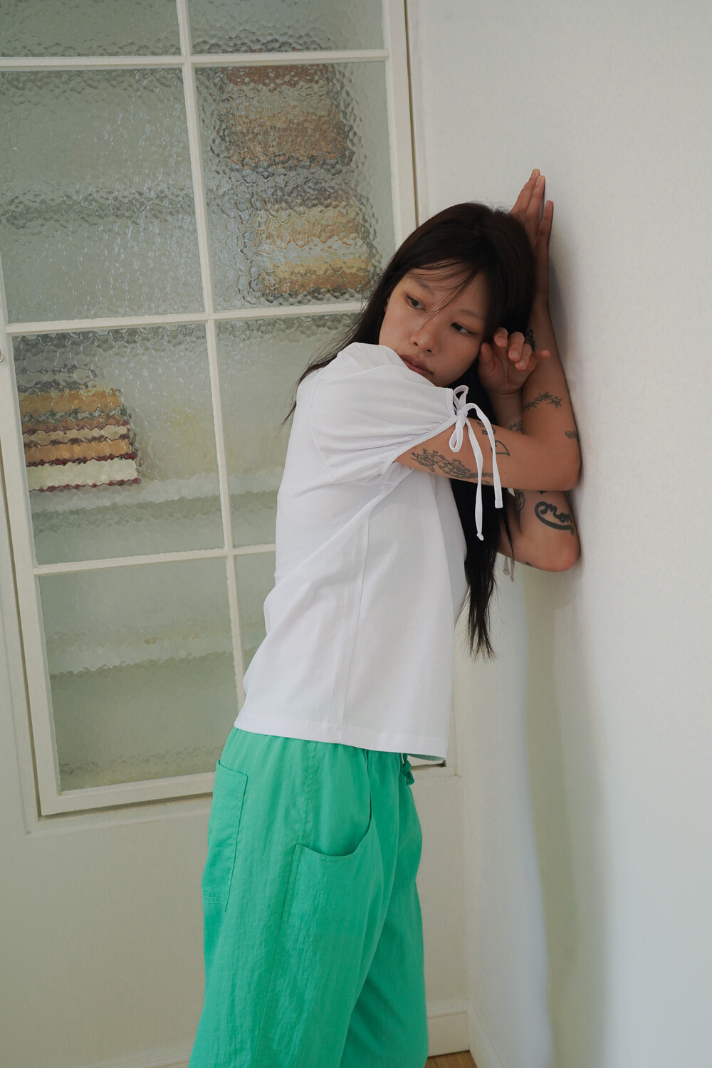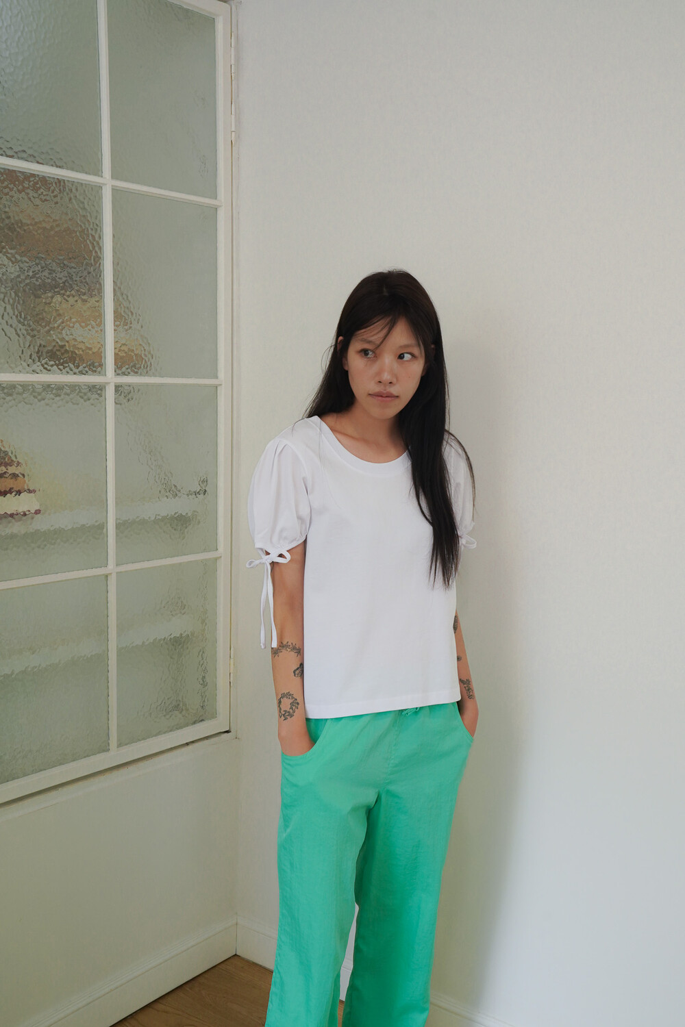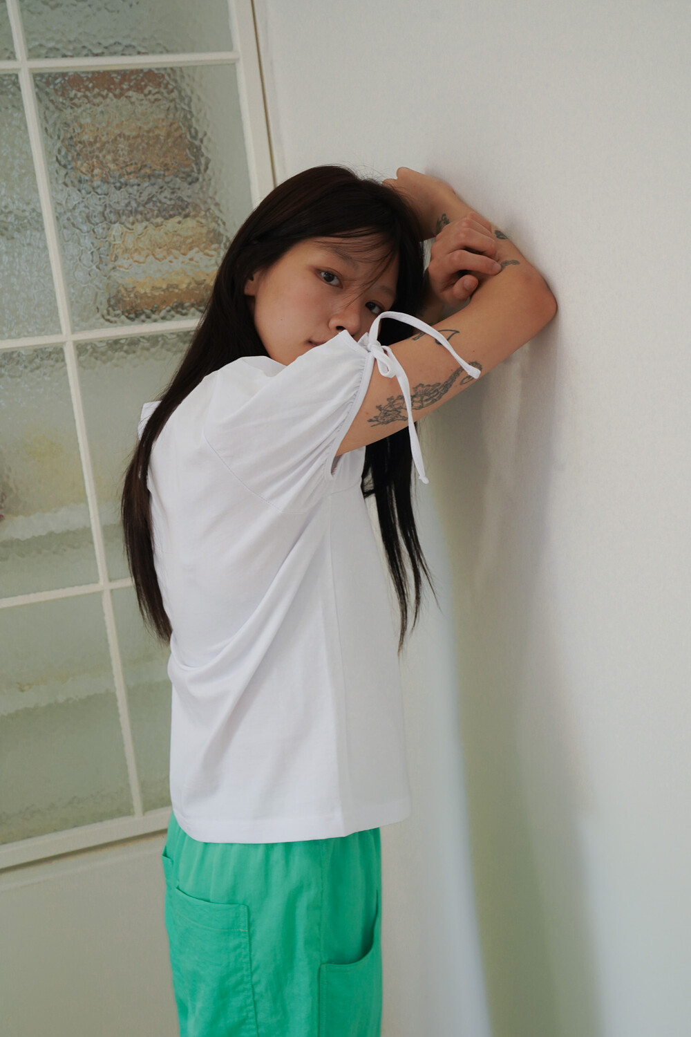 프린세스 퍼프 슬리브와 쇄골이 보이는 네크라인으로 여리한 실루엣이 특징인 반팔입니다.