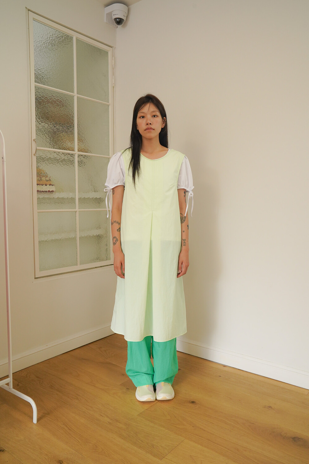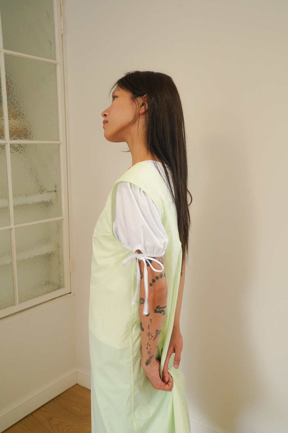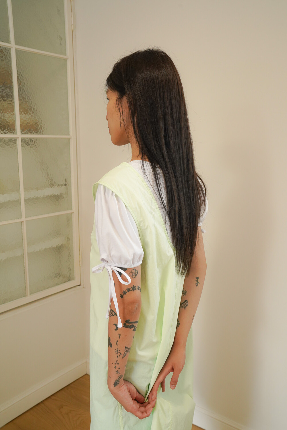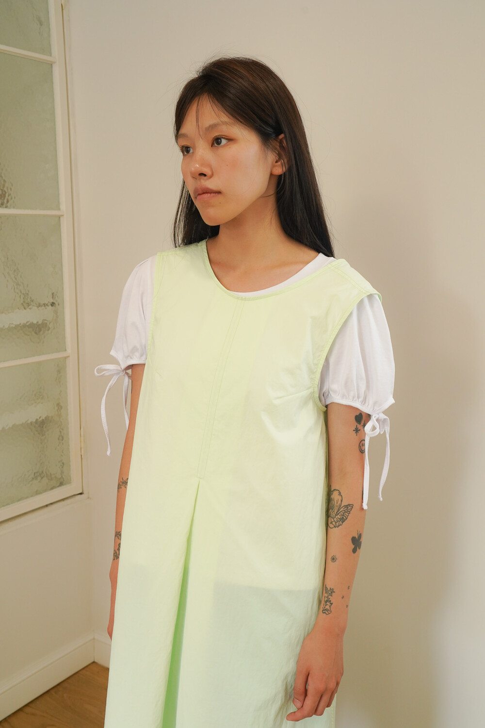 프린세스 퍼프 슬리브와 쇄골이 보이는 네크라인으로 여리한 실루엣이 특징인 반팔입니다.