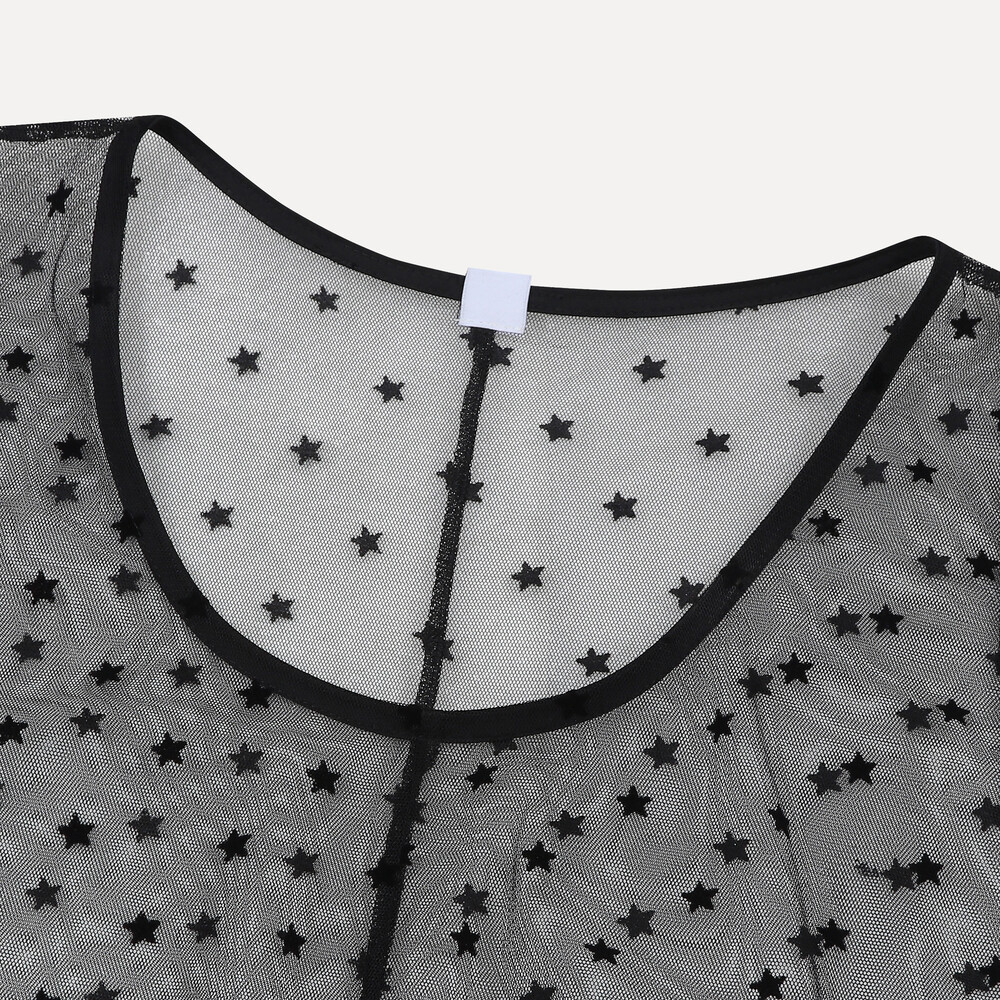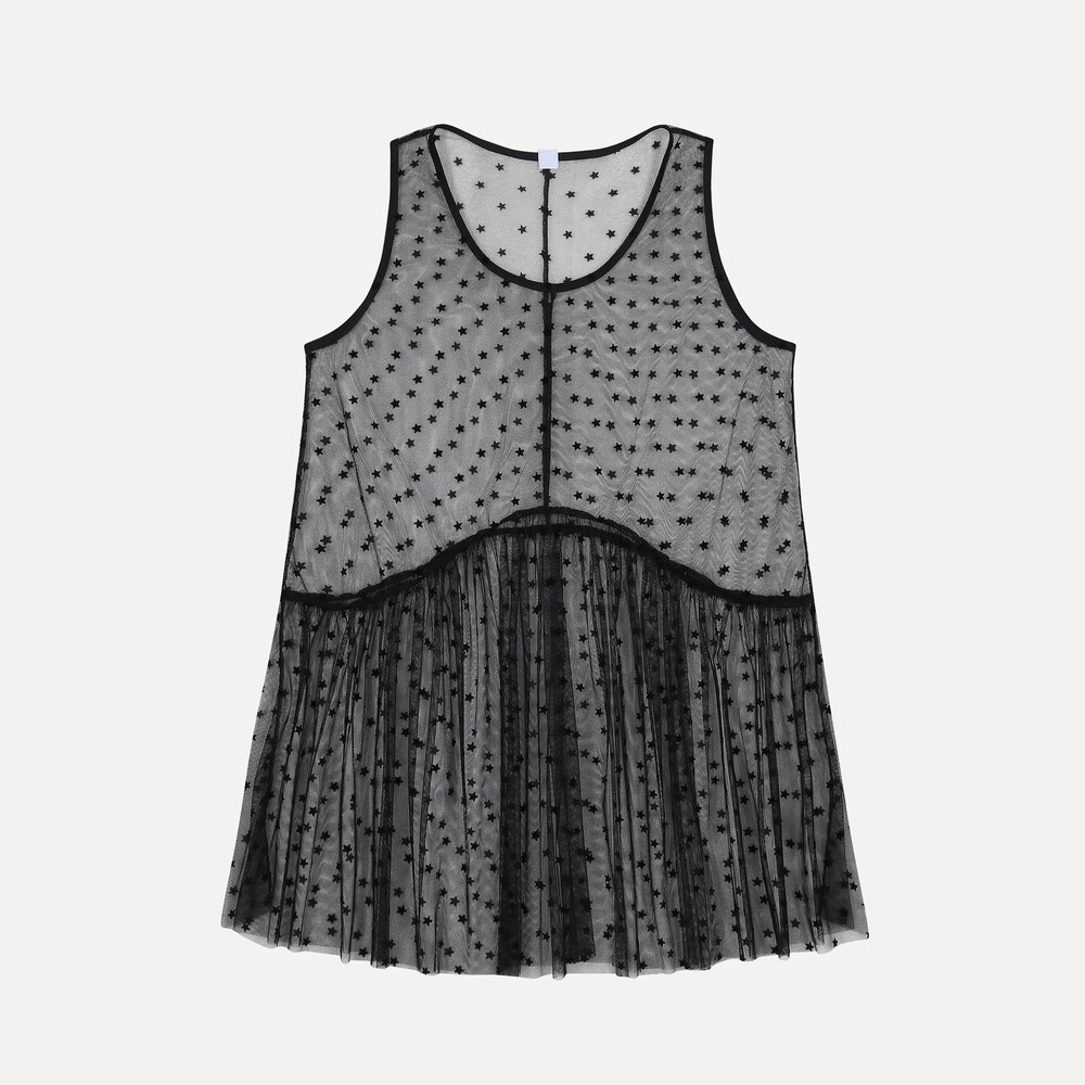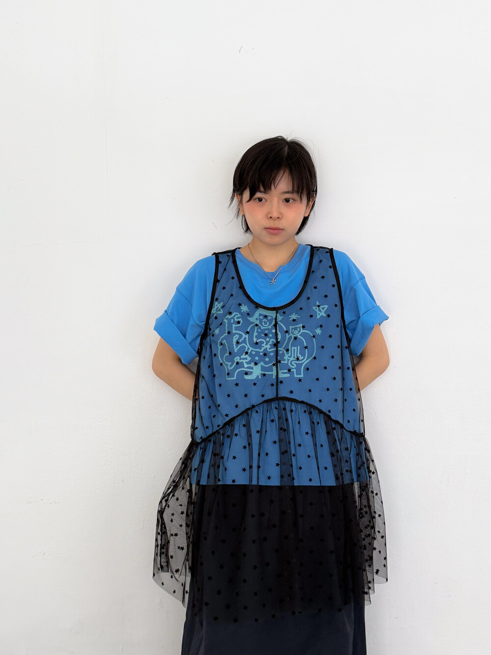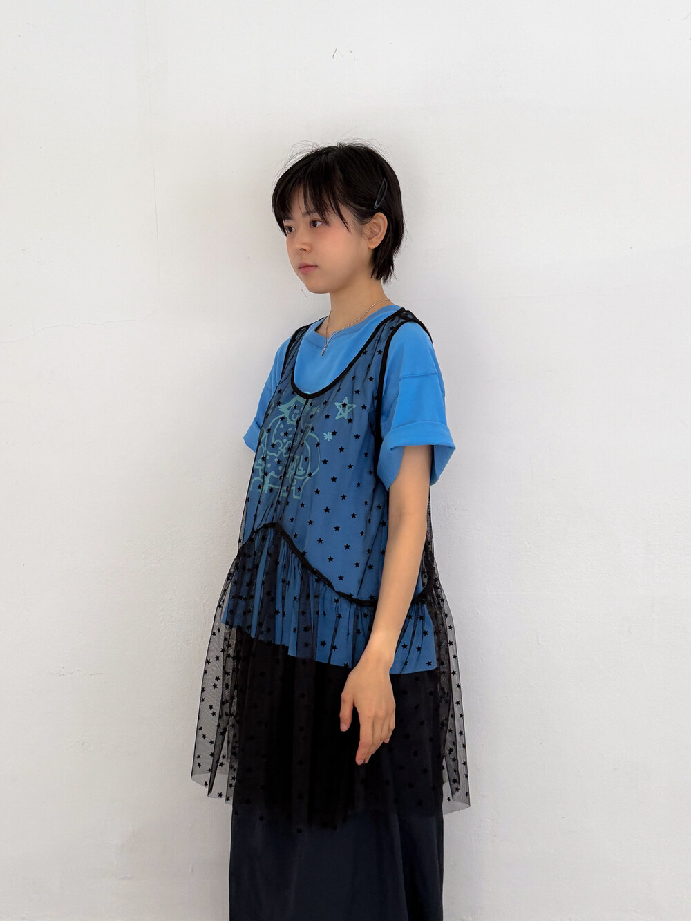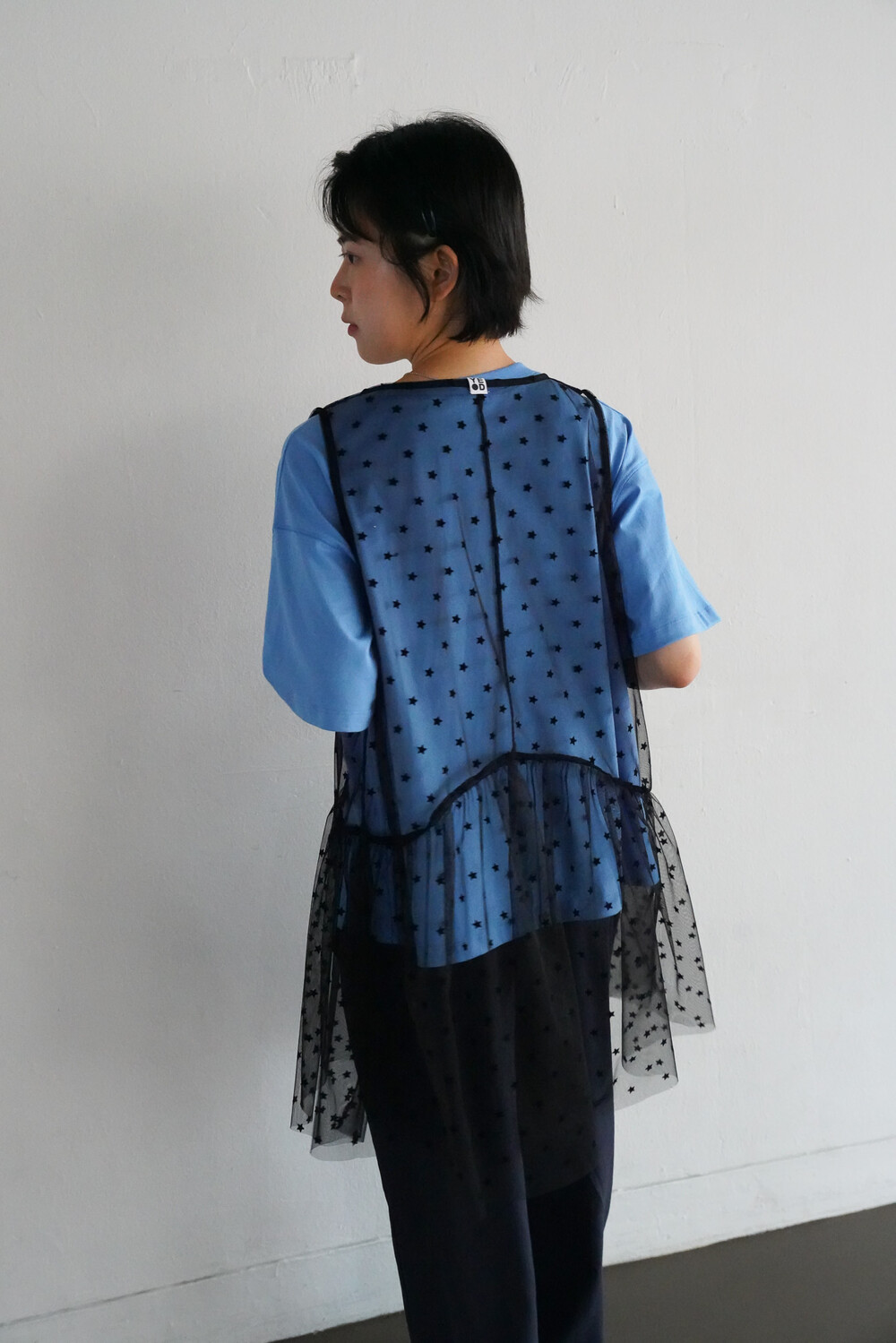 별 모양 후로킹(촉감이 마치 스웨이드 같은 섬유)으로 프린팅된 매쉬 소재를 이용하여 만들어진 제품입니다. 워낙 얇고 가벼워 여름에도 레이어링이 가능한 제품입니다.