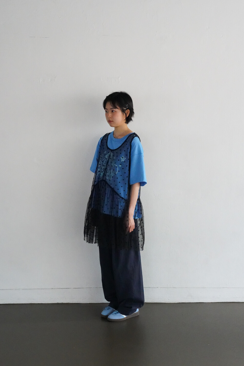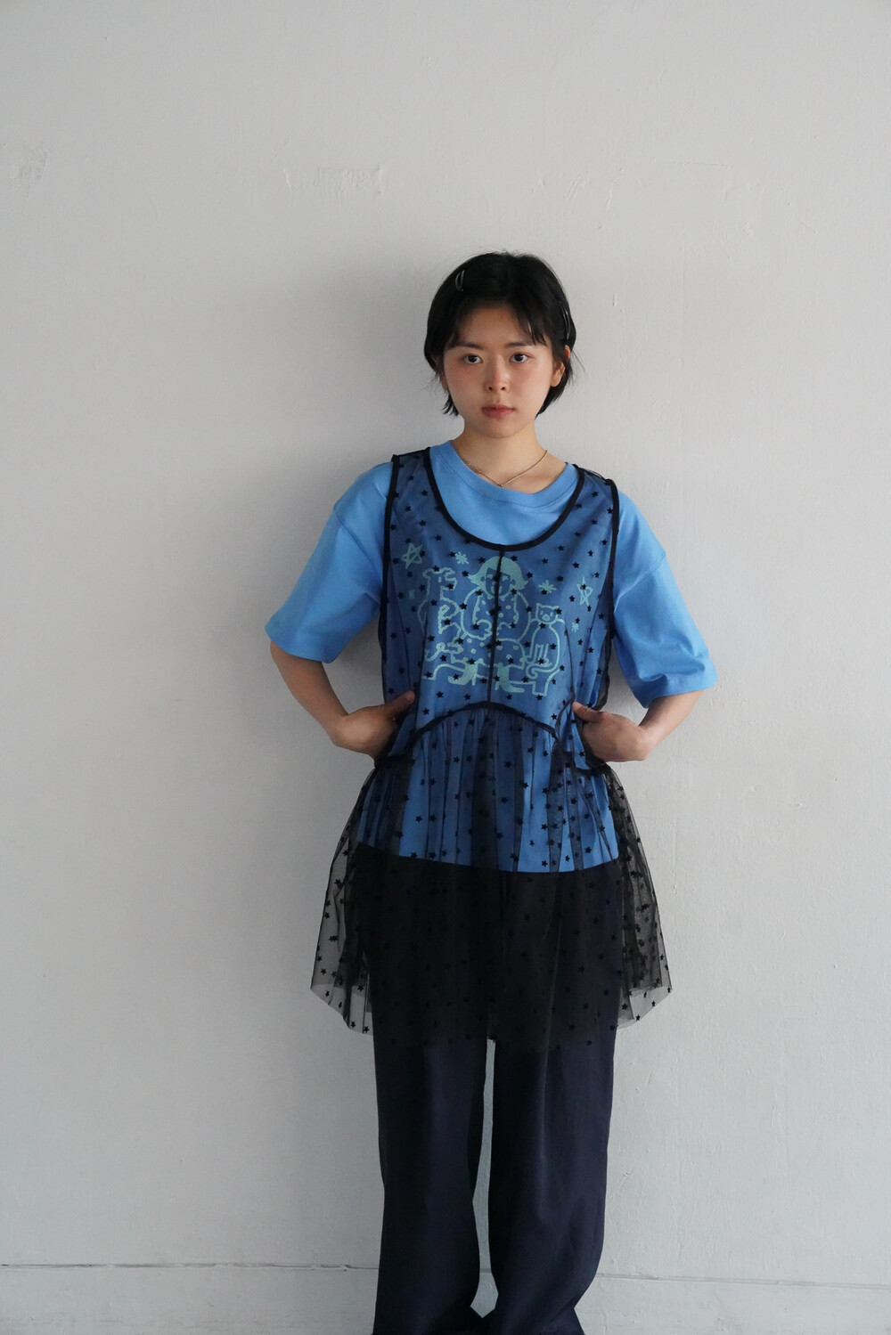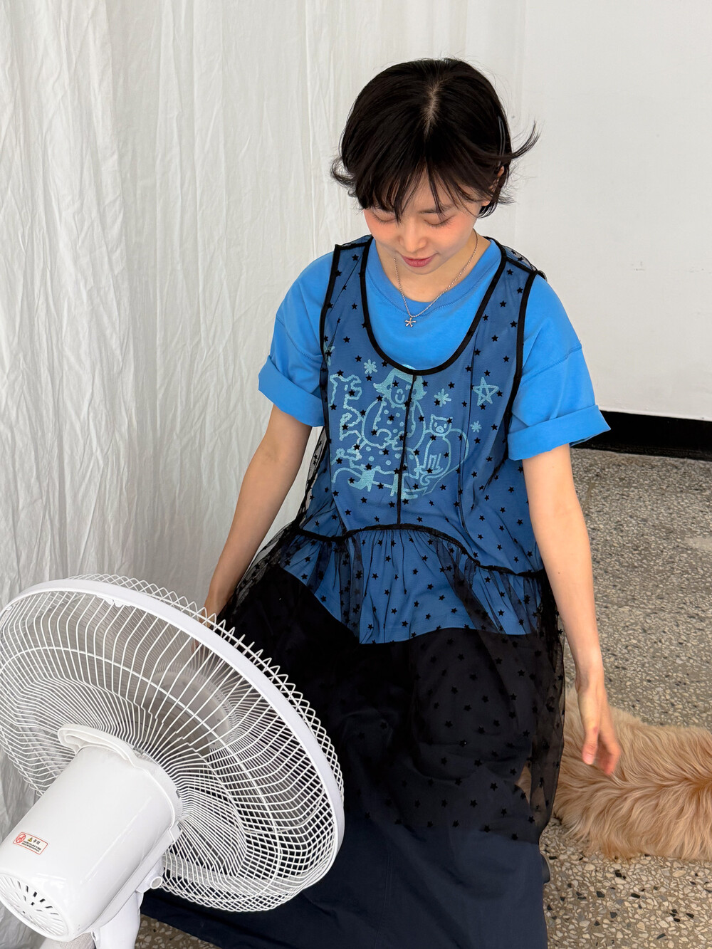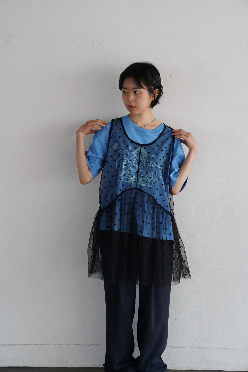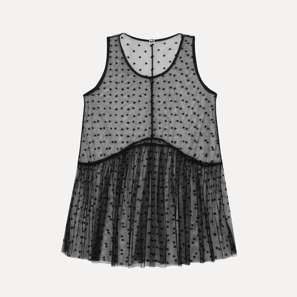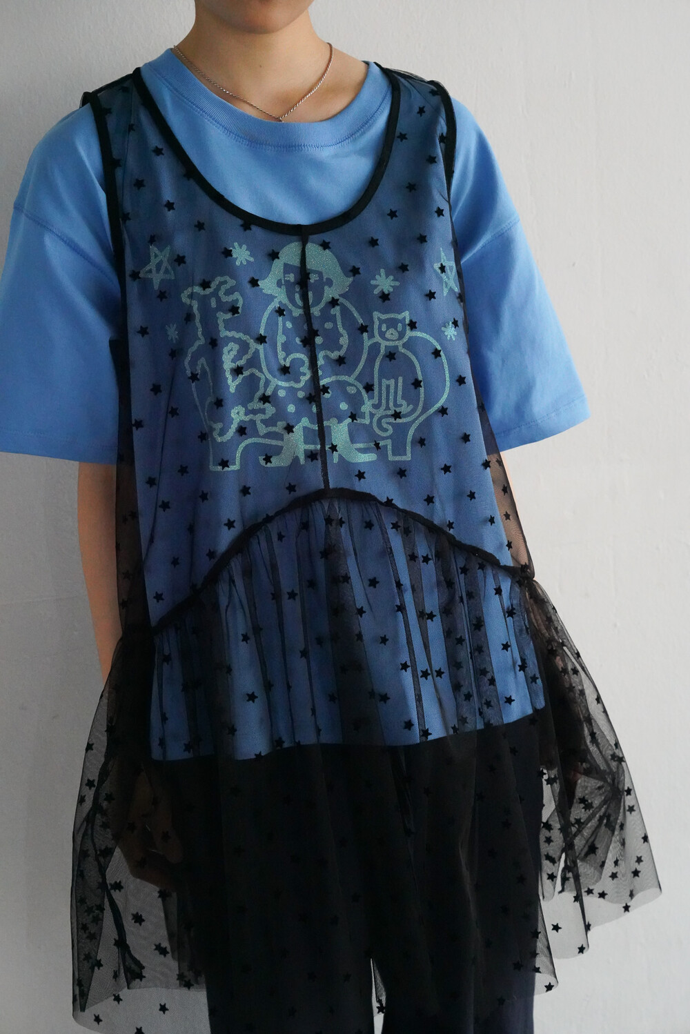 별 모양 후로킹(촉감이 마치 스웨이드 같은 섬유)으로 프린팅된 매쉬 소재를 이용하여 만들어진 제품입니다. 워낙 얇고 가벼워 여름에도 레이어링이 가능한 제품입니다.