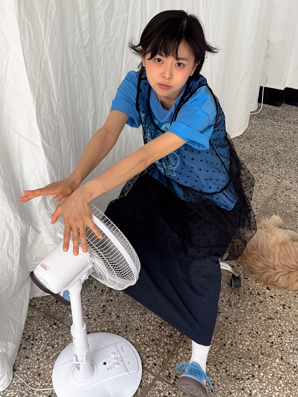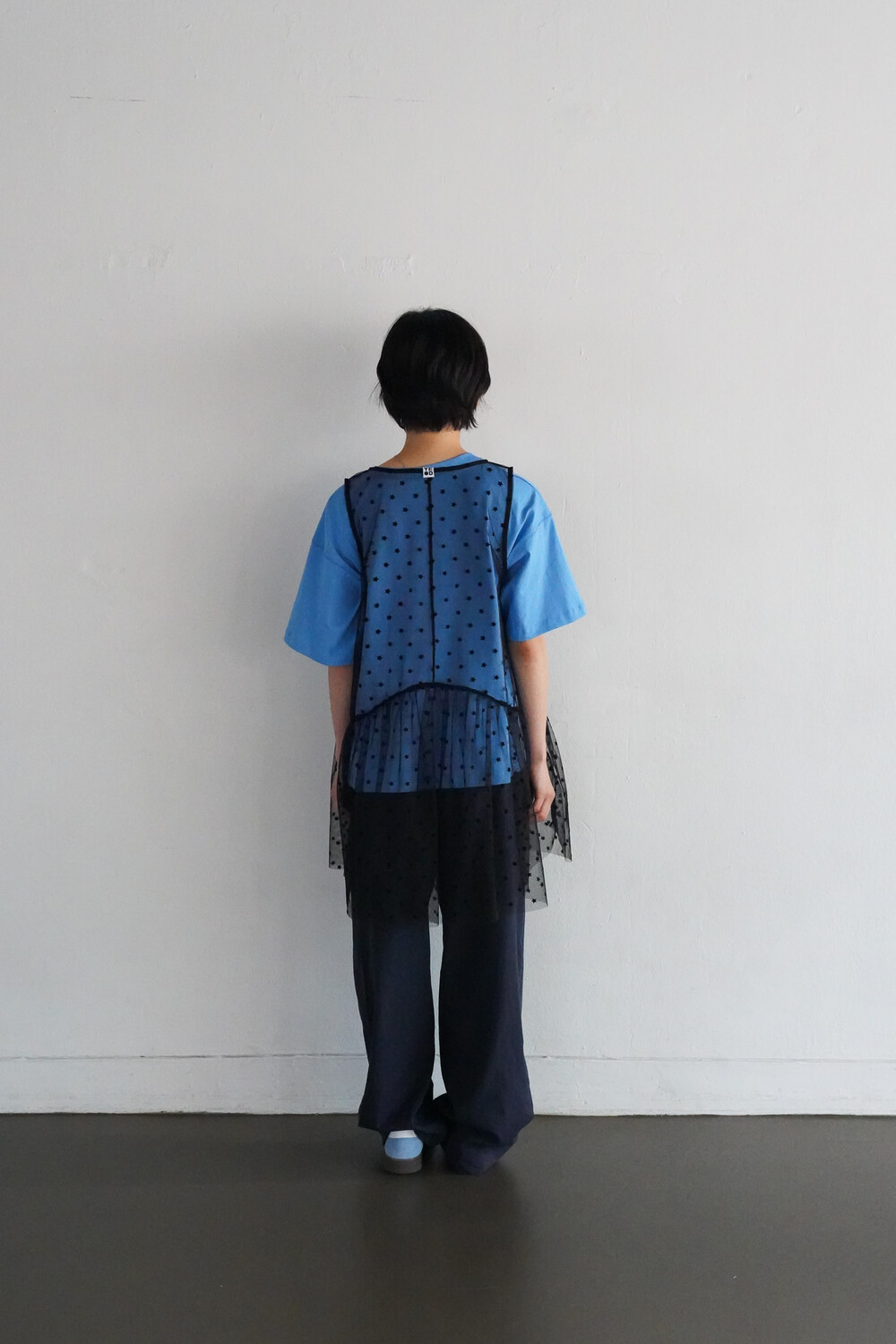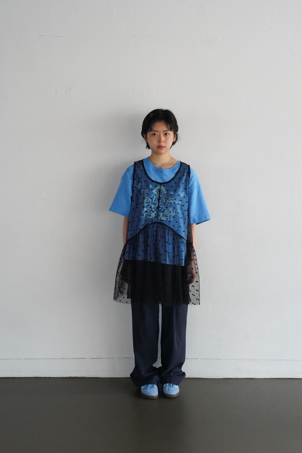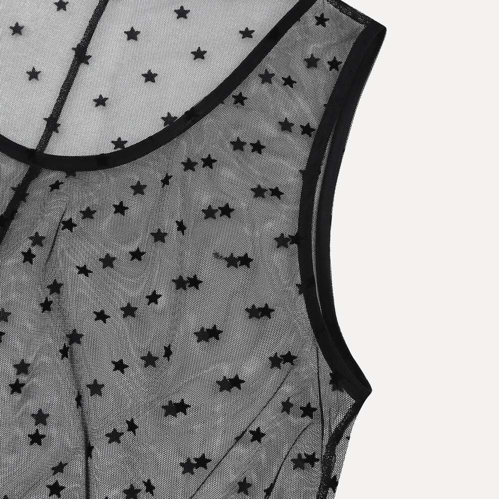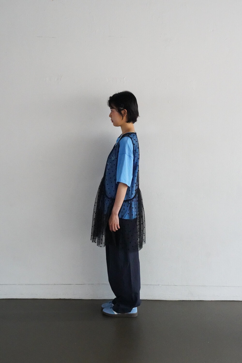 별 모양 후로킹(촉감이 마치 스웨이드 같은 섬유)으로 프린팅된 매쉬 소재를 이용하여 만들어진 제품입니다. 워낙 얇고 가벼워 여름에도 레이어링이 가능한 제품입니다.